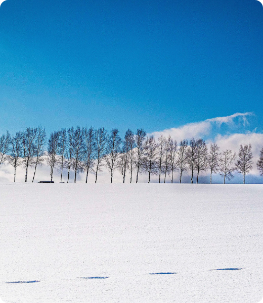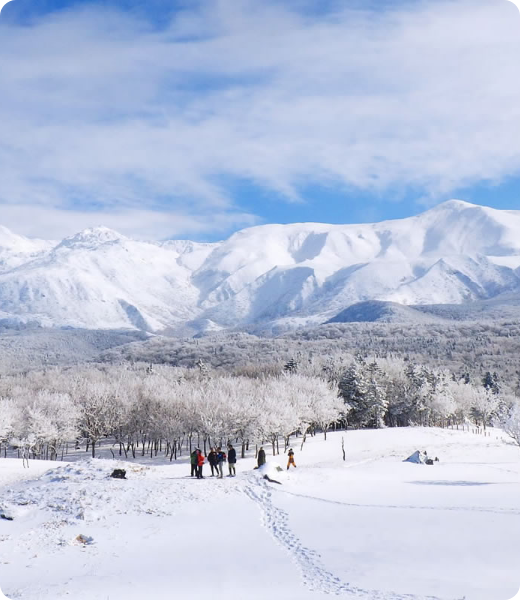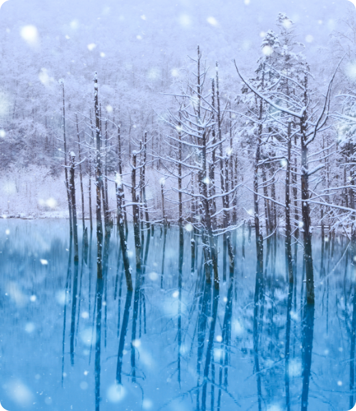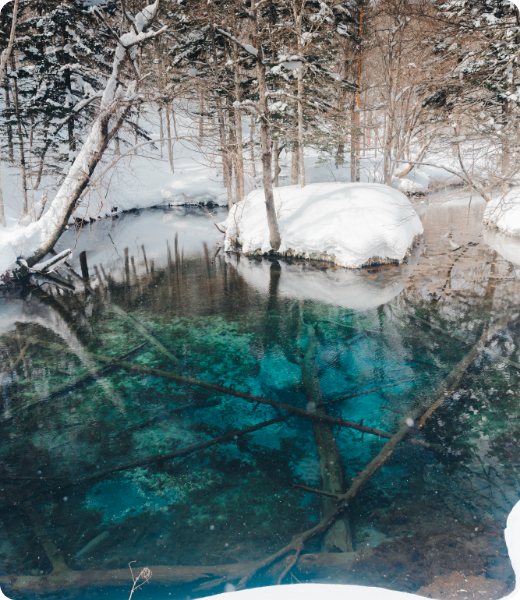 伏流水で年間凍らない透明度抜群の池を、冬はスノーシューツアーで間近に楽しめます。雪に包まれた原生林を進むと、青く輝く水面が姿を現し、エメラルドからコバルトへ変化する神秘的な色合いに思わず息をのむはず。(要事前申込)